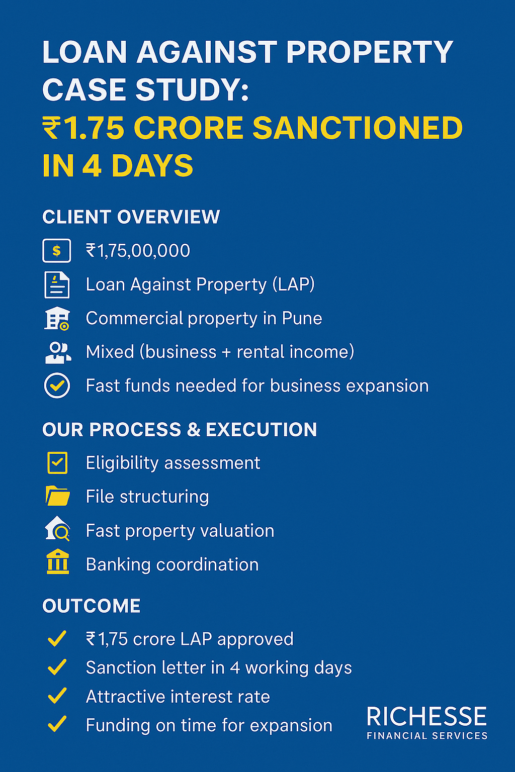 This loan against property case study explains how Richesse Business Solutions secured a ₹1.75 crore sanction for a client in just 4 working days, using strategic structuring and fast execution.